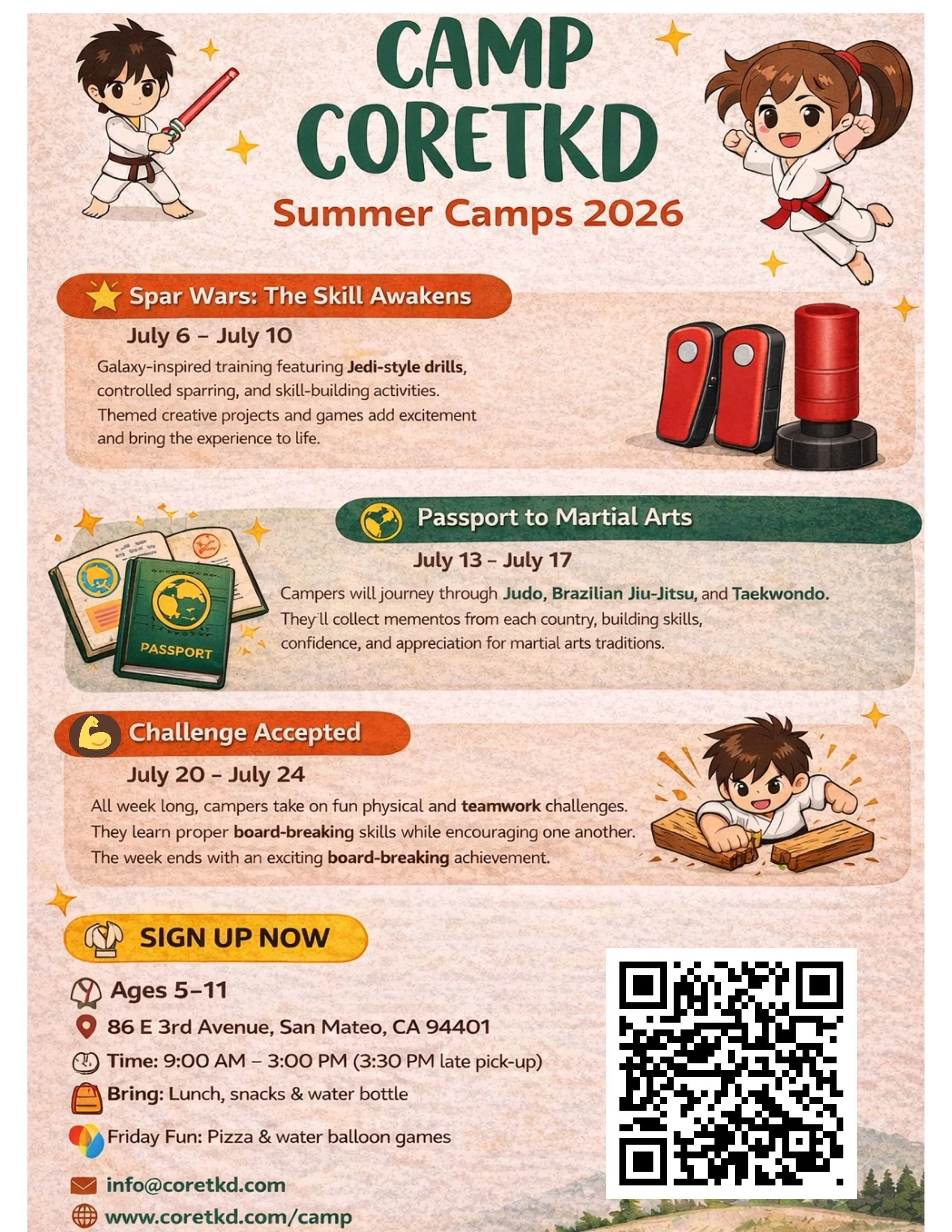 Camp CoreTKD runs from 9:00 AM to 3:00 PM and include martial arts, crafts, and outdoor activities, with lunch at Central Park. On Fridays, we’ll have pizza and water balloon games (weather permitting) to wrap up the week with extra fun!